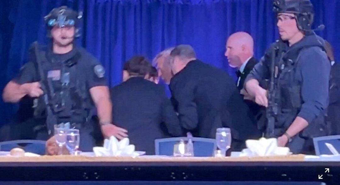 وأفادت وسائل الإعلام الأمريكية بإجلاء الرئيس وزوجته ميلانيا بعد سماع دويّ إطلاق نار من غرفة تقع فوق مكان الفعالية. كما وردت أنباء عن إلقاء القبض على مشتبه به، وأن ترامب وزوجته بخير، وأكد الرئيس ذلك بالفعل، بعد بعض الوقت.