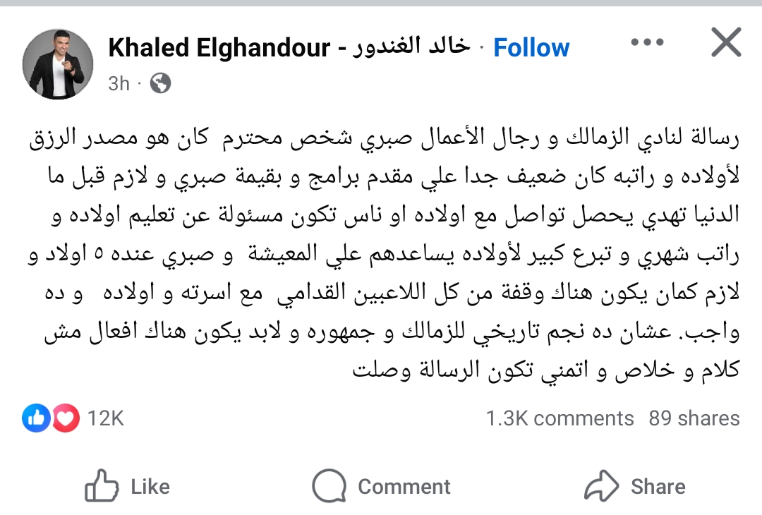 وقال في بوست له على حسابه في منصة فيس بوك، أثار ردود فعل سلبية وإيجابية، بإفادته أنها رسالة لنادي الزمالك و رجال الأعمال، صبري شخص محترم كان هو مصدر الرزق لأولاده و راتبه كان ضعيف جدا علي مقدم برامج و بقيمة صبري.