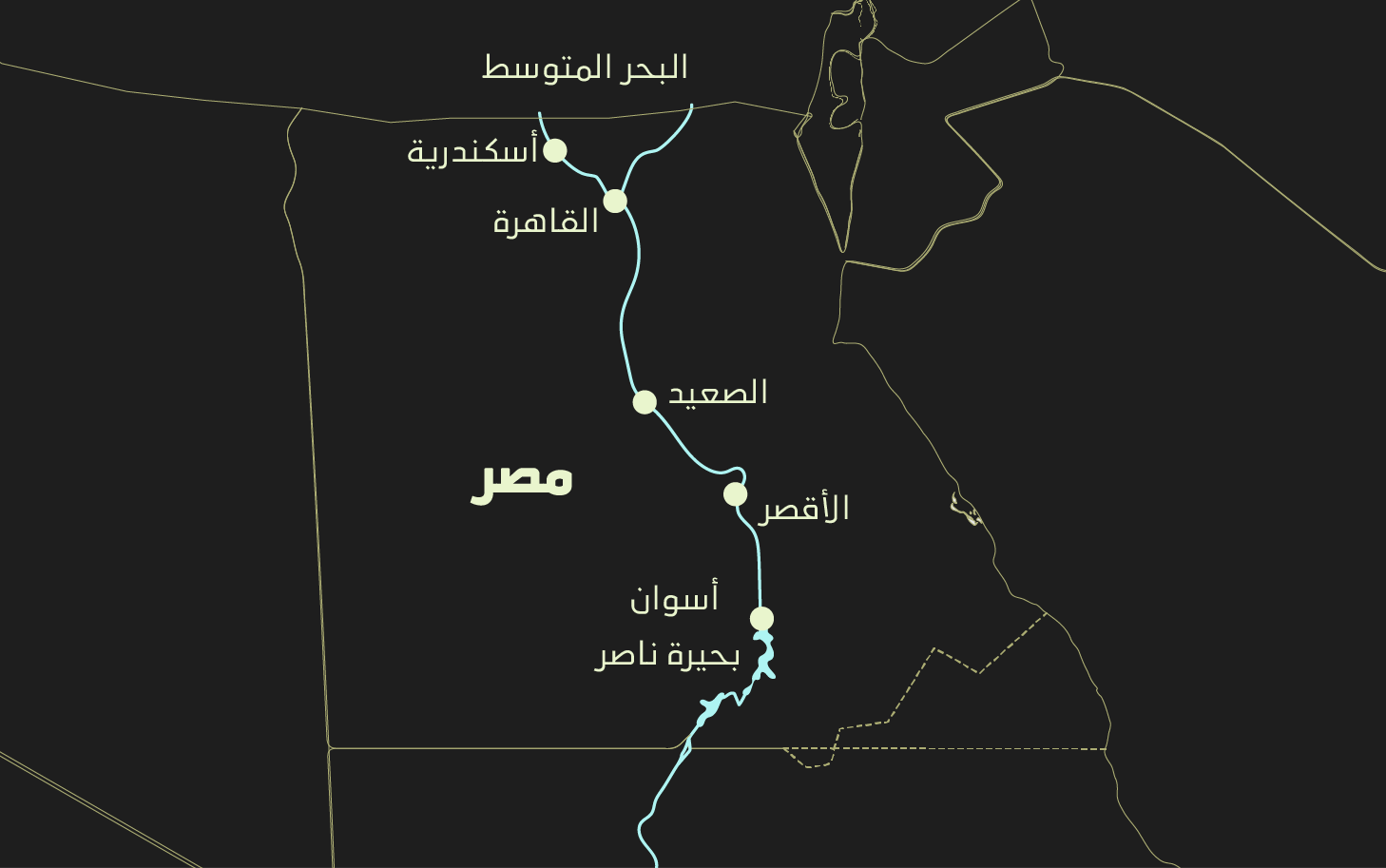 مع عبوره الحدود السودانية – المصرية، يواصل النيل مساره حتى يصل إلى بحيرة ناصر الصناعية خلف السد العالي في محافظة أسوان، ثم يمضي في طريقه شمالاً ويعبر بمحافظات الصعيد المصرية وصولاً إلى العاصمة القاهرة.