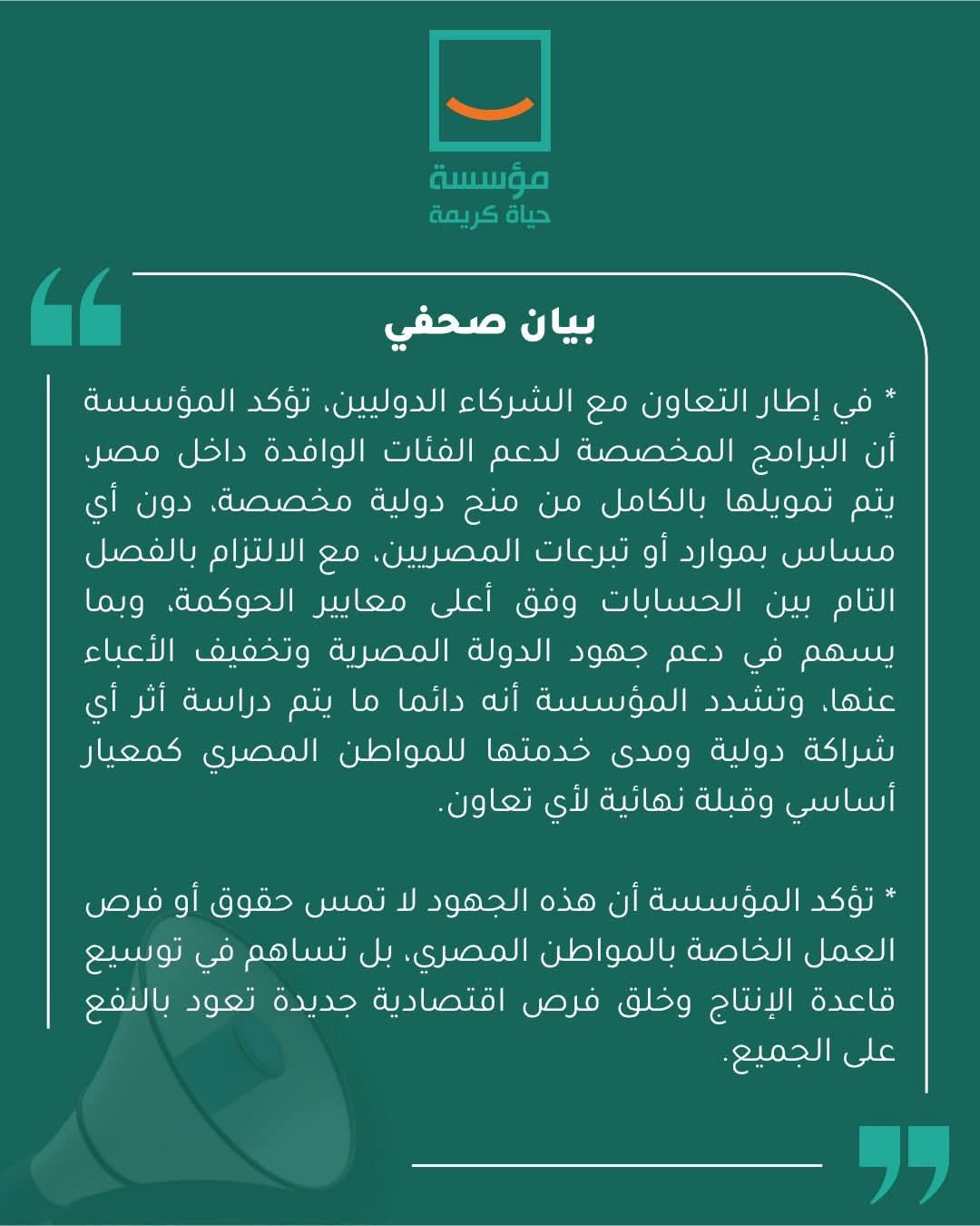 وشددت مؤسسة “حياة كريمة” على التزامها الكامل بالشفافية والأمانة في إدارة مواردها، مع وضع المواطن المصري في صدارة أولوياتها.