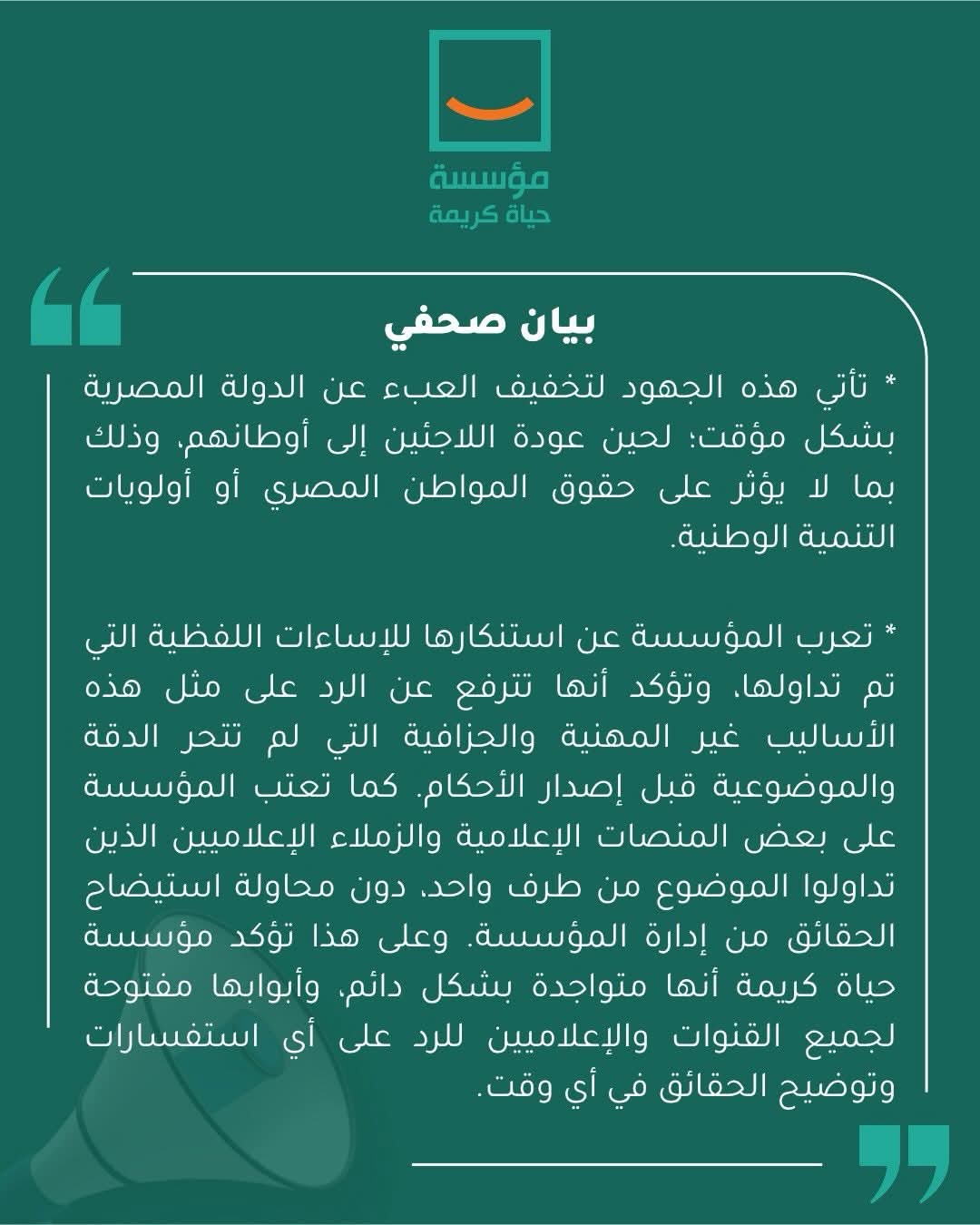 في محاولة فاشلة لتهدئة الهجوم الشعبي عليها، أصدرت مؤسسة “حياة كريمة”، بيانًا في منتصف الليل، أكدت فيه إن كل التبرعات التى تجمعها توجه للمصريين فقط، وإن ما دار عن دعم للاجئين سيكون من خلال دعم مؤسسات تمويل دولية.