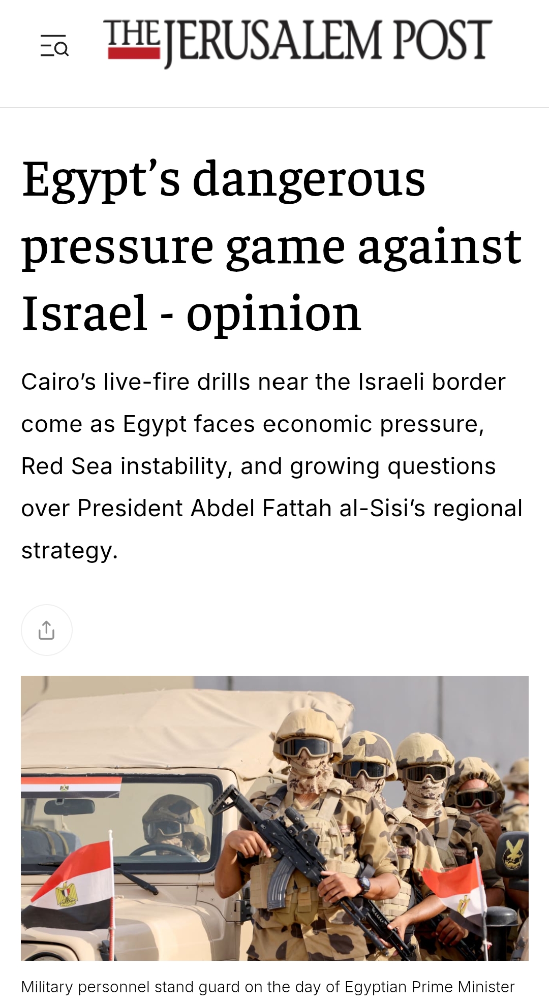 ووفق ما جاء في مقالته التى نشرتها صحيفة جيروزاليم بوست الإسرائيلية اليوم الثلاثاء، فيدعى كوهين، تأتي تدريبات الذخيرة الحية التي تجريها القاهرة بالقرب من الحدود الإسرائيلية في وقت تواجه فيه مصر ضغوطاً اقتصادية، وعدم استقرار في البحر الأحمر، وتزايد التساؤلات حول استراتيجية الرئيس عبد الفتاح السيسي الإقليمية.
