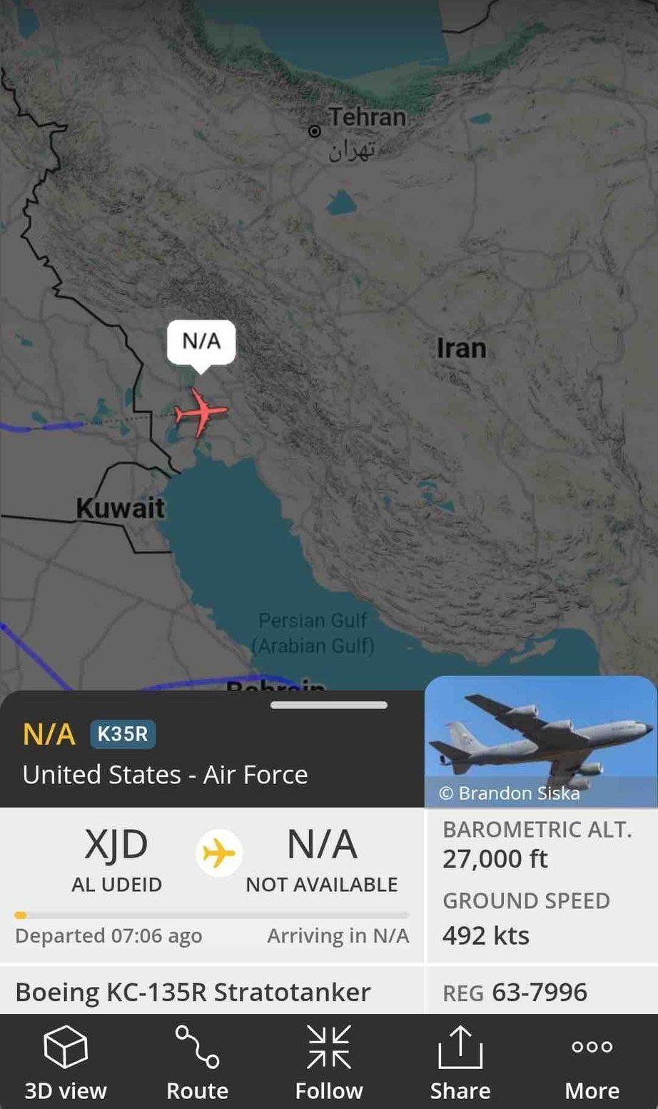وسط تطورات متسارعة وتلاسنات ومواقف متصاعدة، يترقب العابم هجوما أمريكيا ضد إيران، حيث رصد طائرة إرضاع أمريكية تعبر الحدود لإيران ليلة الاثنين، تزامنا مع تصريح الرئيس ​الأميركي دونالد ​ترمب، في ‌ساعة مبكرة من صباح الاثنين، إنه يدرس مجموعة ⁠من ‌الردود ​على الاضطرابات والاحتجاجات المتصاعدة في ⁠إيران، ‌بما ⁠في ⁠ذلك الخيارات العسكرية المحتملة، مع استمرار التظاهرات الضخمة التي تعصف بالبلاد.