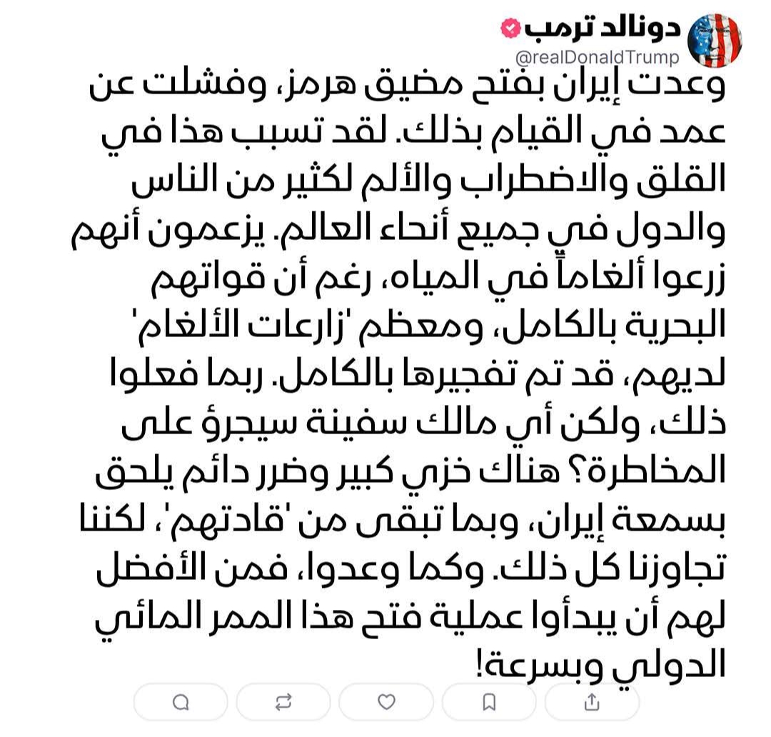لقد لحقت بإيران، وبما تبقى من “قادتها”، إهانة كبرى وضرر دائم في السمعة، لكننا تجاوزنا كل ذلك الآن. وكما وعدوا، فعليهم أن يبدؤوا فورًا وبسرعة في فتح هذا الممر المائي الدولي!