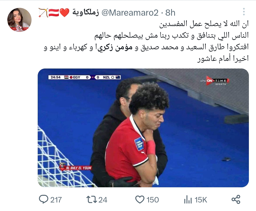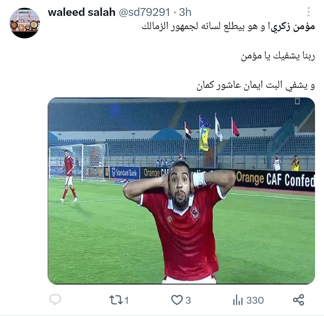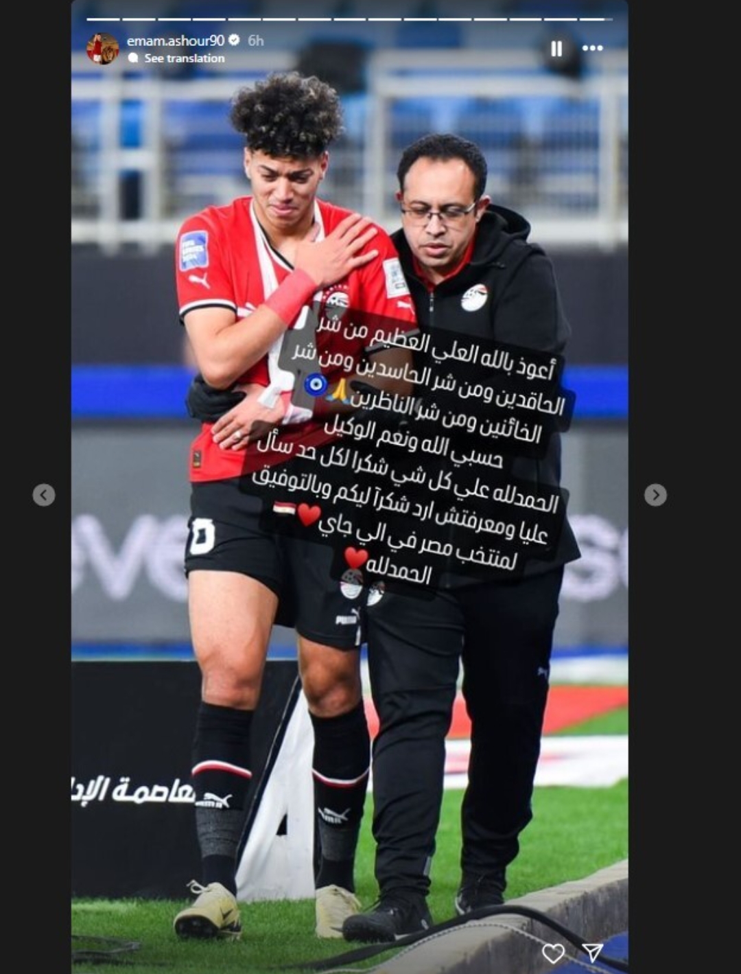 ونشر عاشور على حسابه في موقع “إنستغرام” صورة له وهو يغادر الملعب بعد تعرضه للإصابة وكتب: “أعوذ بالله العلي العظيم من شر الحاقدين، ومن شر الحاسدين ومن شر الخائنين ومن شر الناظرين”.