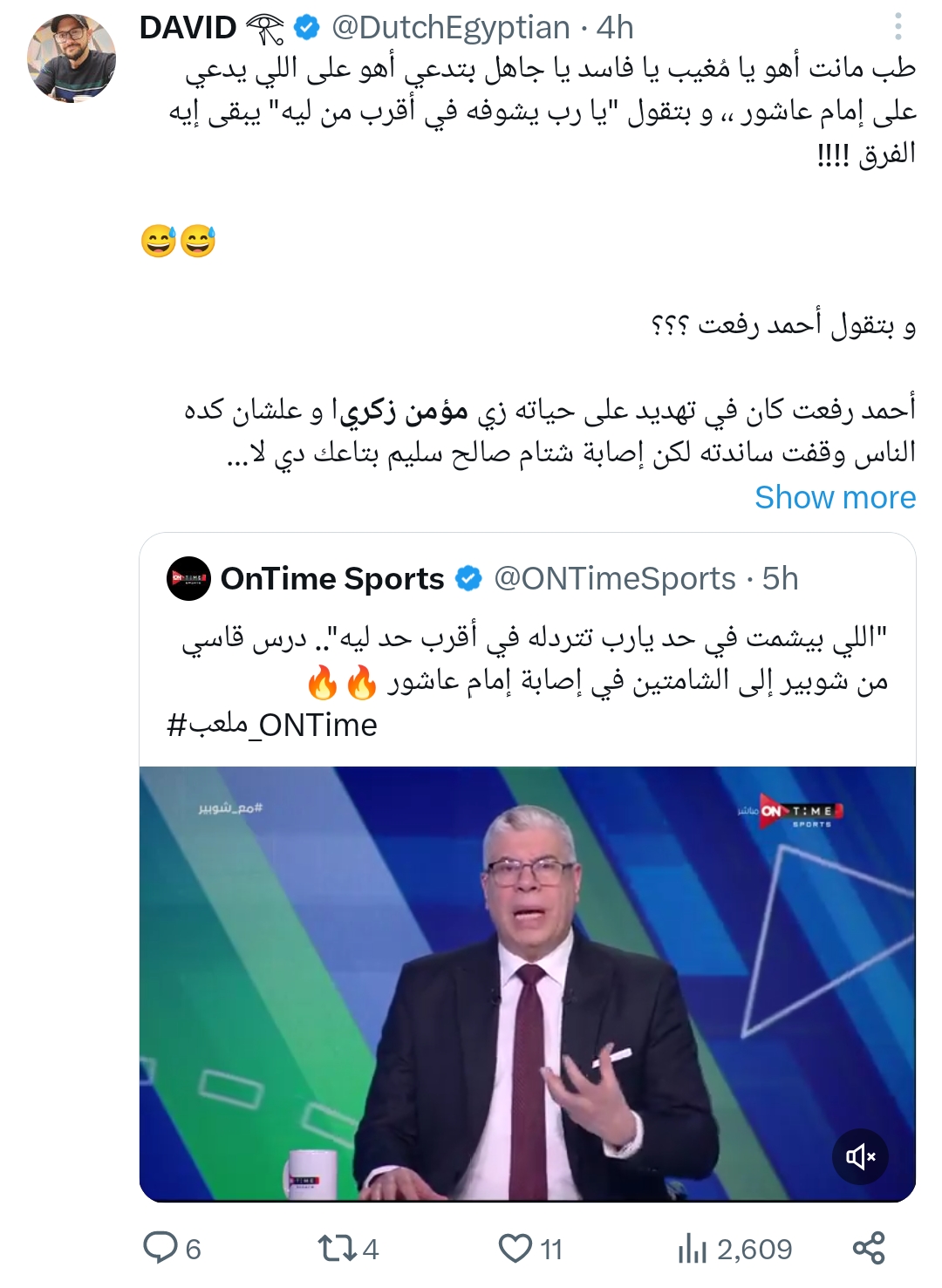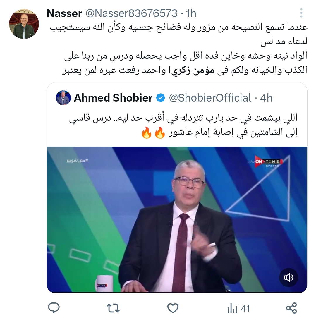 وللأسف جاره العديد من الموتورين الأهلاوية بالسباب والتلاسن الفظيع، في موقف غير رمضانى بالمرة ، والأغرب أن الأمر وصل للإعلاميين ومنهم القدامى مثل أحمد شوبير ، الذى تورط في الأزمة بشكل مثير للتساؤلات ، حينما دعا على هؤلاء الموتورين بقوله ، يارب اللى يتمنى حاجة وحشة لحد تحصل له في غالى عنده.