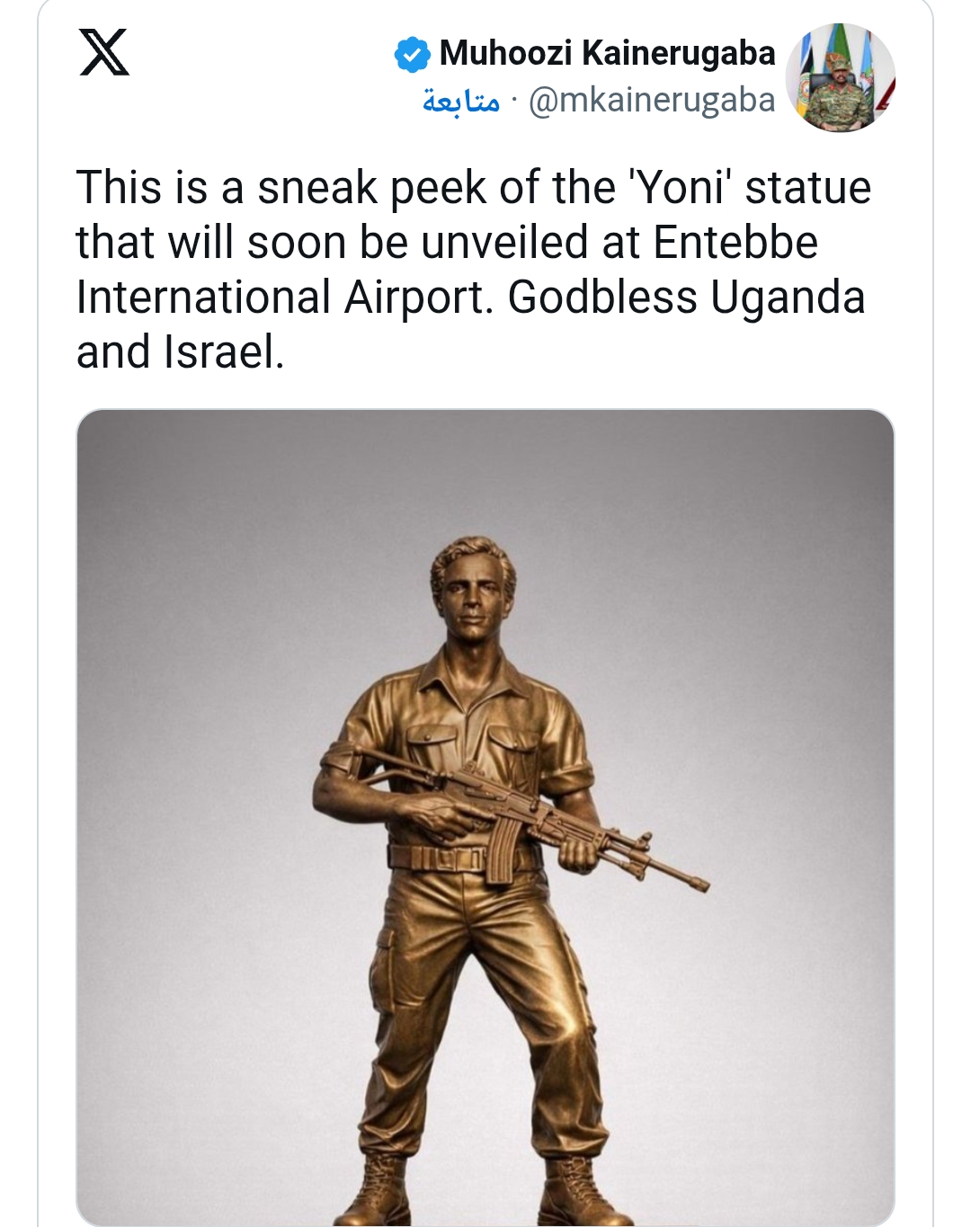 فيما أعلن موسيفيني الشهر الماضي عن نيته إقامة تمثال تذكاري ليوني نتنياهو في مطار عنتيبي، حيث سقط خلال عملية “جوناثان”. واليوم، ضمن رسائله الداعمة لإسرائيل، نشر قائد الجيش الأوغندى، لمحةً عن التمثال المزمع إقامته هناك. وكتب: “هذه لمحة عن تمثال يوني الذي سيُكشف عنه قريباً في مطار عنتيبي الدولي. بارك الله أوغندا وإسرائيل”، وفق تعبيره.