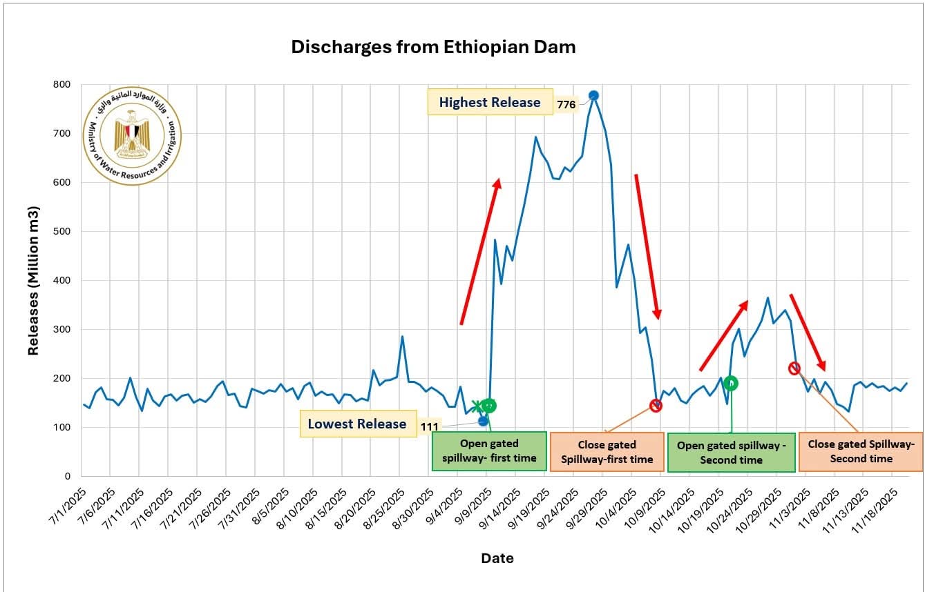 وقد أوضحت الوزارة في بيان سابق أن مُشغّل السد الإثيوبي، عقب انتهاء ما يدعى “بالافتتاح”، قام يوم ١٠ سبتمبر ٢٠٢٥ بتصريف كميات كبيرة من المياه بلغت نحو ٤٨٥ مليون م٣، تلتها زيادات مفاجئة وغير منتظمة وصلت إلى ٧٨٠ مليون م٣ في ٢٧ سبتمبر ٢٠٢٥.