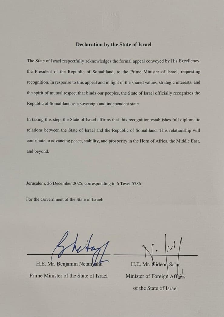 ووفق التقدير الإسرائيلي، فالقرن الأفريقي والبحر الأحمر، وهي منطقة برزت أهميتها الأمنية والاستراتيجية لإسرائيل مجدداً خلال العامين الماضيين، تسعى أرض الصومال إلى ترسيخ مكانتها كدولة مستقلة موالية للغرب، غير معترف بها دولياً. هدفها النهائي هو الحصول على اعتراف دولي وإقامة تحالفات مع دول تدعمها في مواجهة عدوها: حكومة الصومال في مقديشو.
