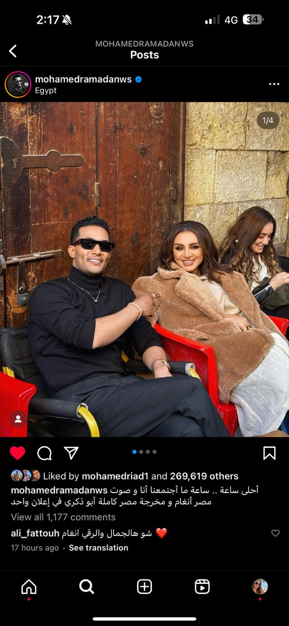 وحرص رمضان على التعليق عبر حسابه الرسمي على انستجرام وكتب: “أحلى ساعة .. ساعة ما اجتمعنا أنا وصوت مصر أنغام ومخرجة مصر كاملة أبو ذكرى فى إعلان واحد”.