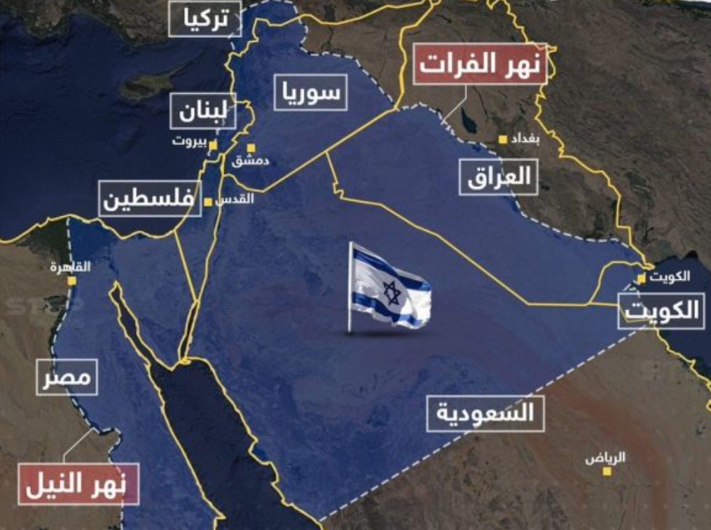 أما المفهوم الجيوسياسي لـ «إسرائيل الكبرى» فيشير إلى تلك الرقعة من الأرض التي تحدها من الشمال جنوب تركيا، ومن الجنوب المملكة العربية السعودية، ومن الشرق نهر الفرات، ومن الغرب نهر النيل، بما عليها من مدن ودول عربية كاملة، فتمتد من شرق دلتا النيل شمالا، حتى حلايب وشلاتين جنوب مصر، ومعها مناطق شاسعة من السعودية تضم الجوف وتبوك، وأجزاء من المدينة المنورة وحائل والحدود الشمالية. وصولا إلى كل المحافظات العراقية والسورية الواقعة غرب الفرات، ناهيك عن كل اراض الكويت والأردن ولبنان وفلسطين.