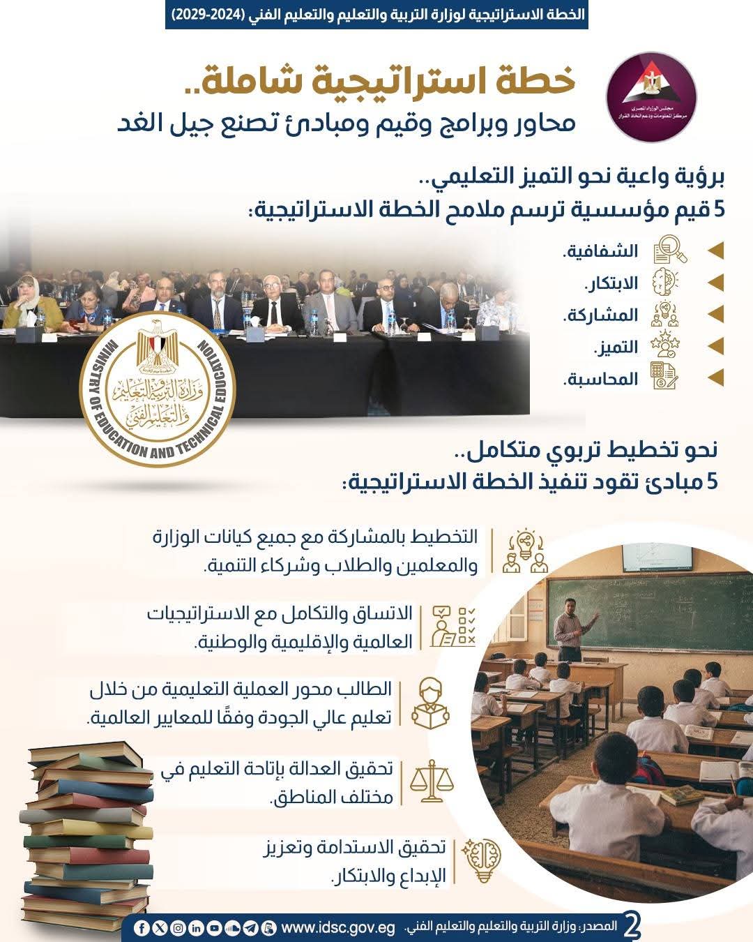 وانطلاقًا من هذا التوجّه، أطلقت وزارة التربية والتعليم والتعليم الفني الخطةَ الاستراتيجية (2024-2029)، التي تُعدّ نقلةً نوعيةً في مجال التخطيط التربوي، وتمثل دليلًا واضحًا على التزام الدولة ببناء جيلٍ مبتكرٍ، مؤهَّلٍ للمستقبل، ومتمكّنٍ من أدوات العصر الرقمي.