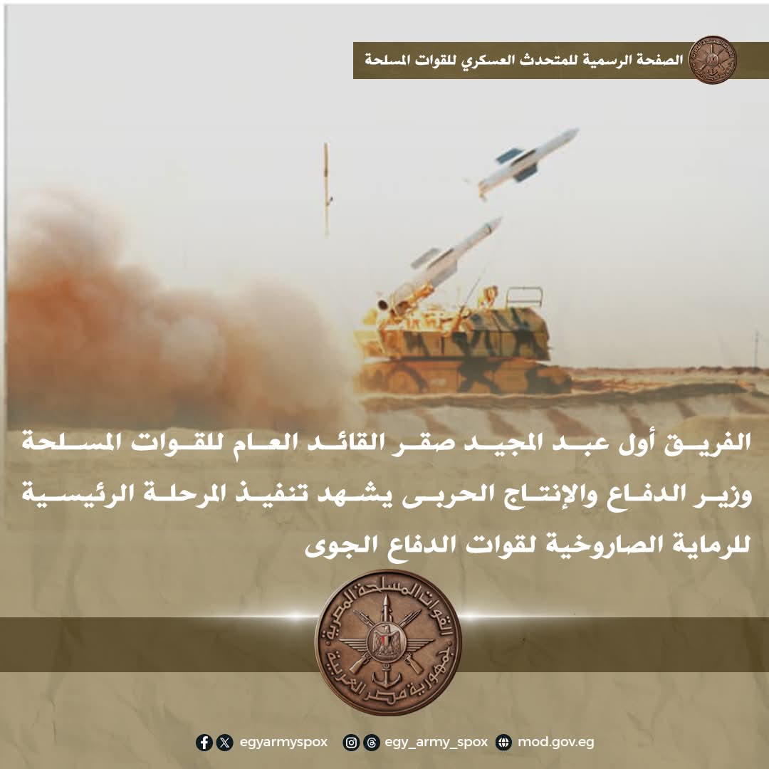 في إطار الأنشطة العملياتية المتلاحقة للقوات المسلحة المصرية، شهد الفريق أول / عبد المجيد صقر القائد العام للقوات المسلحة وزير الدفاع والإنتاج الحربى تنفيذ المرحلة الرئيسية للرماية الصاروخية لعناصر من قوات الدفاع الجوى.