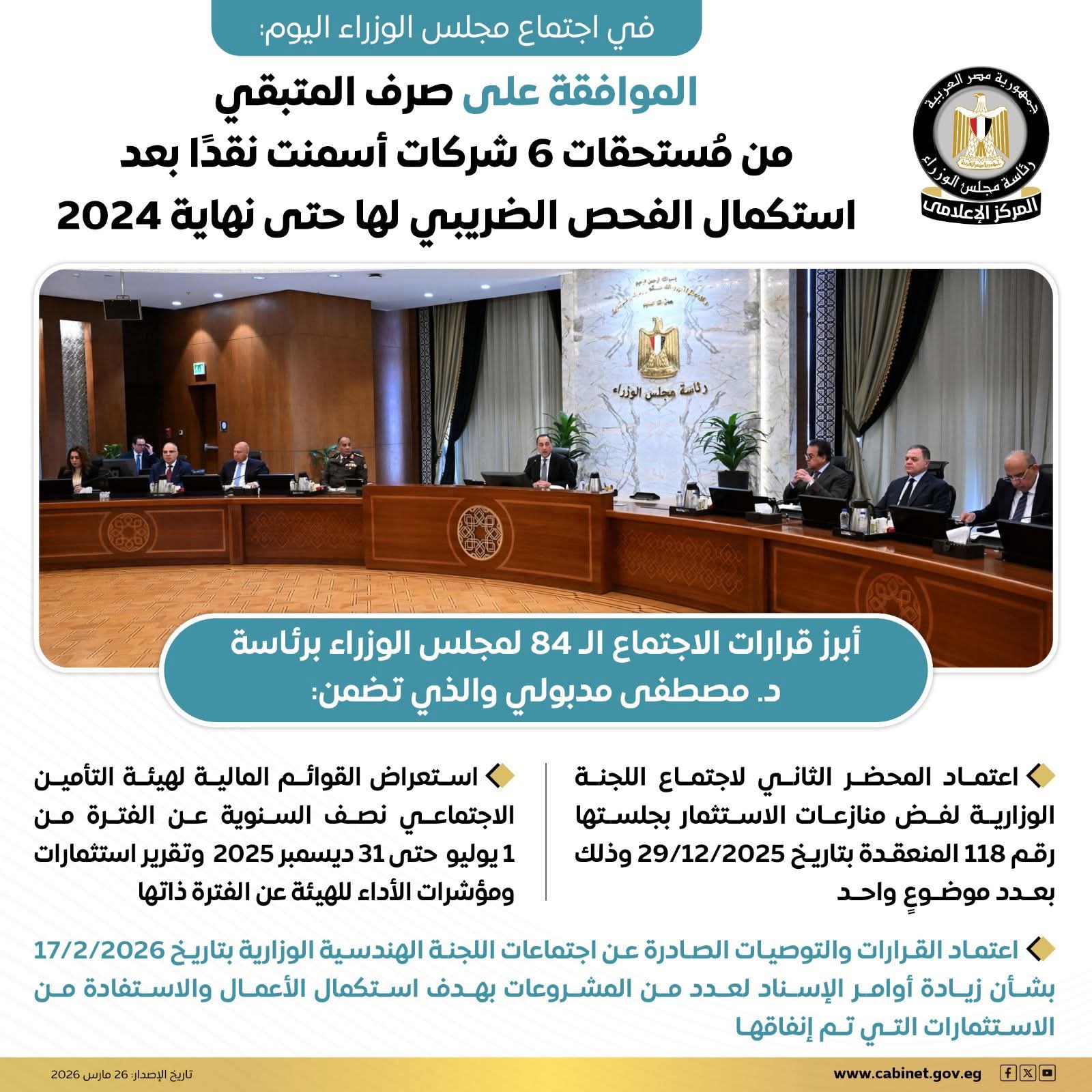 وافق مجلس الوزراء، خلال اجتماعه اليوم، برئاسة الدكتور مصطفى مدبولي، رئيس مجلس الوزراء، على الموازنة العامة للدولة للسنة المالية 2026/2027، بعد العرض على الرئيس عبد الفتاح السيسي، رئيس الجمهورية، والمتضمنة ربط موازنات 65 هيئة عامة اقتصادية، والموافقة أيضاً على خطة التنمية الاقتصادية والاجتماعية للعام المالي 2026/2027.