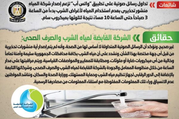 وحدة مكافحة الشائعات تداول رسائل صوتية على تطبيق “واتس آب” تزعم إصدار شركة المياه منشور تحذيري بعدم استخدام المياه لأغراض…